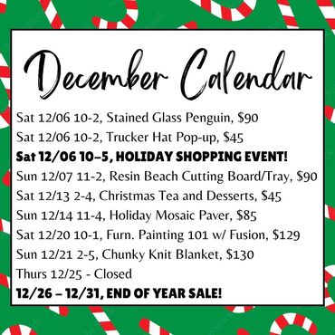 We offer beginner level classes, right here at our store every month! From furniture painting, to tea-parties and arts of all kinds, you are sure to have a blast and learn something new! All of our classes are held right here at the store, in our private back room, and we include all of the supplies needed. Make sure to leave time before or after your event for a little shopping!